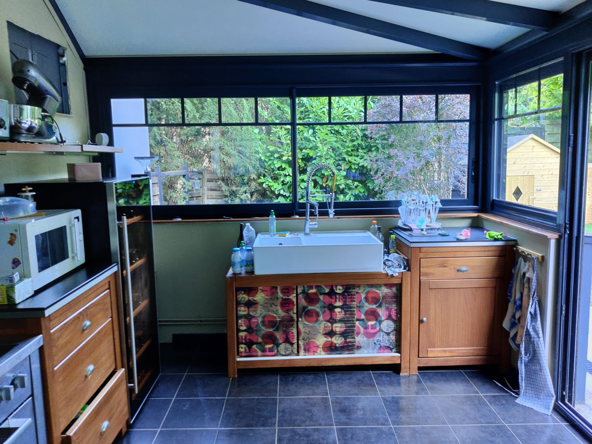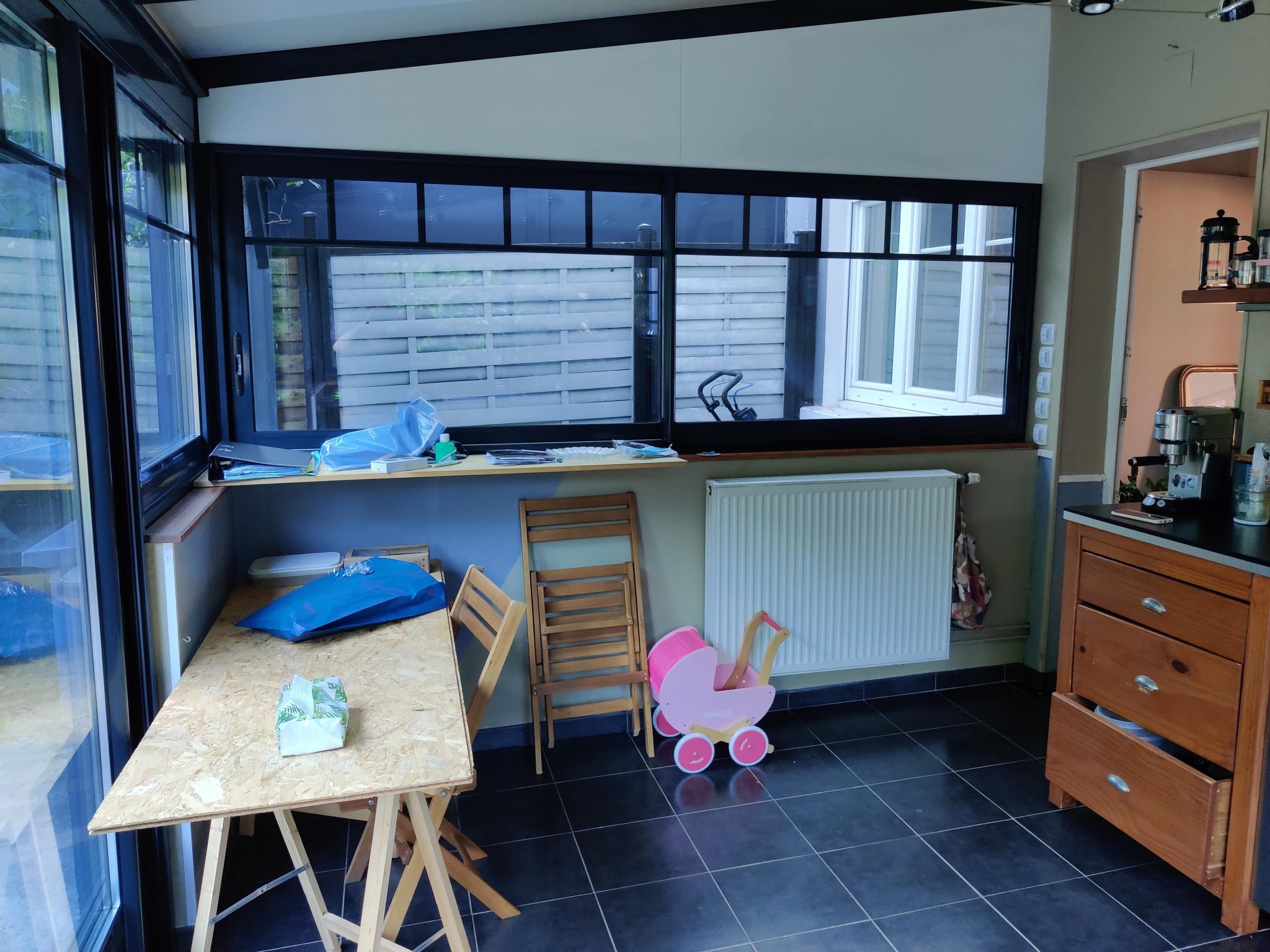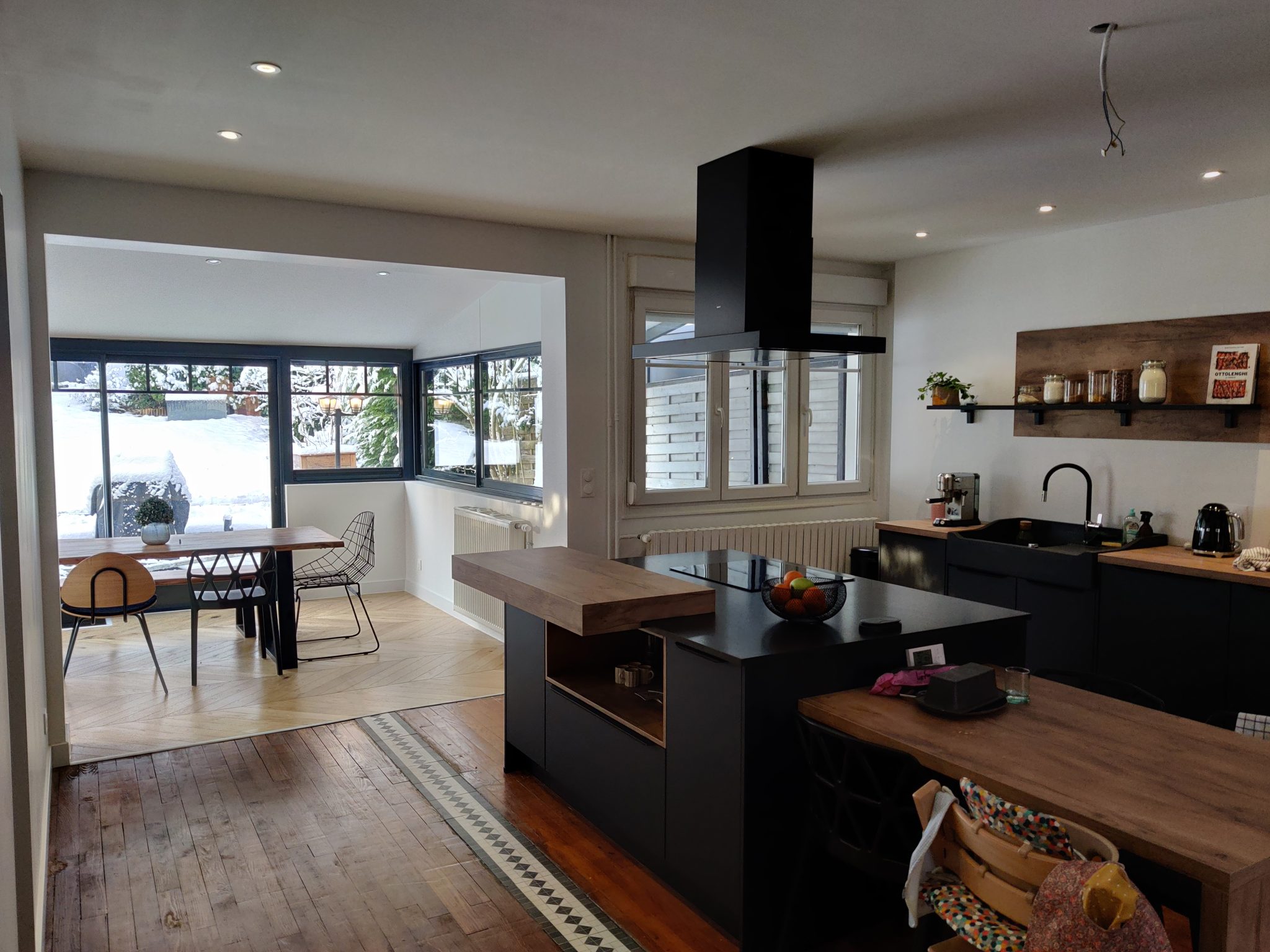 Transformation de la véranda existante accueillant la cuisine en extension. Déplacement de la cuisine, transformation des volumes, redistribution des pièces